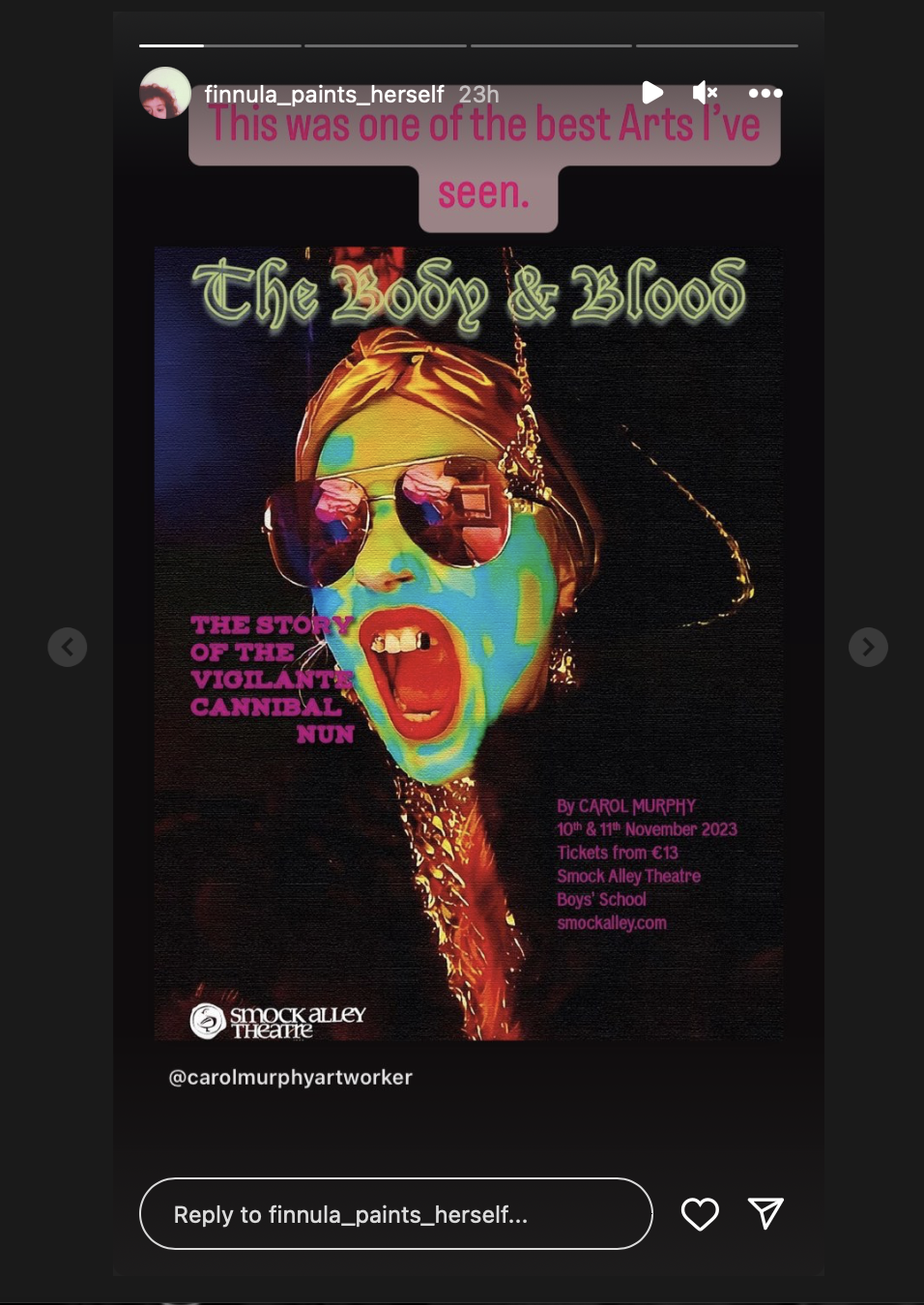 Then I took The Body & Blood on a UK and Ireland tour as a live one woman show, starting with VAULT Festival in London and continuing to The Cathedral Quarter Arts Festival, The Open House Festival and The Lyric Lounge in Belfast and Smock Alley Theatre in Dublin.
