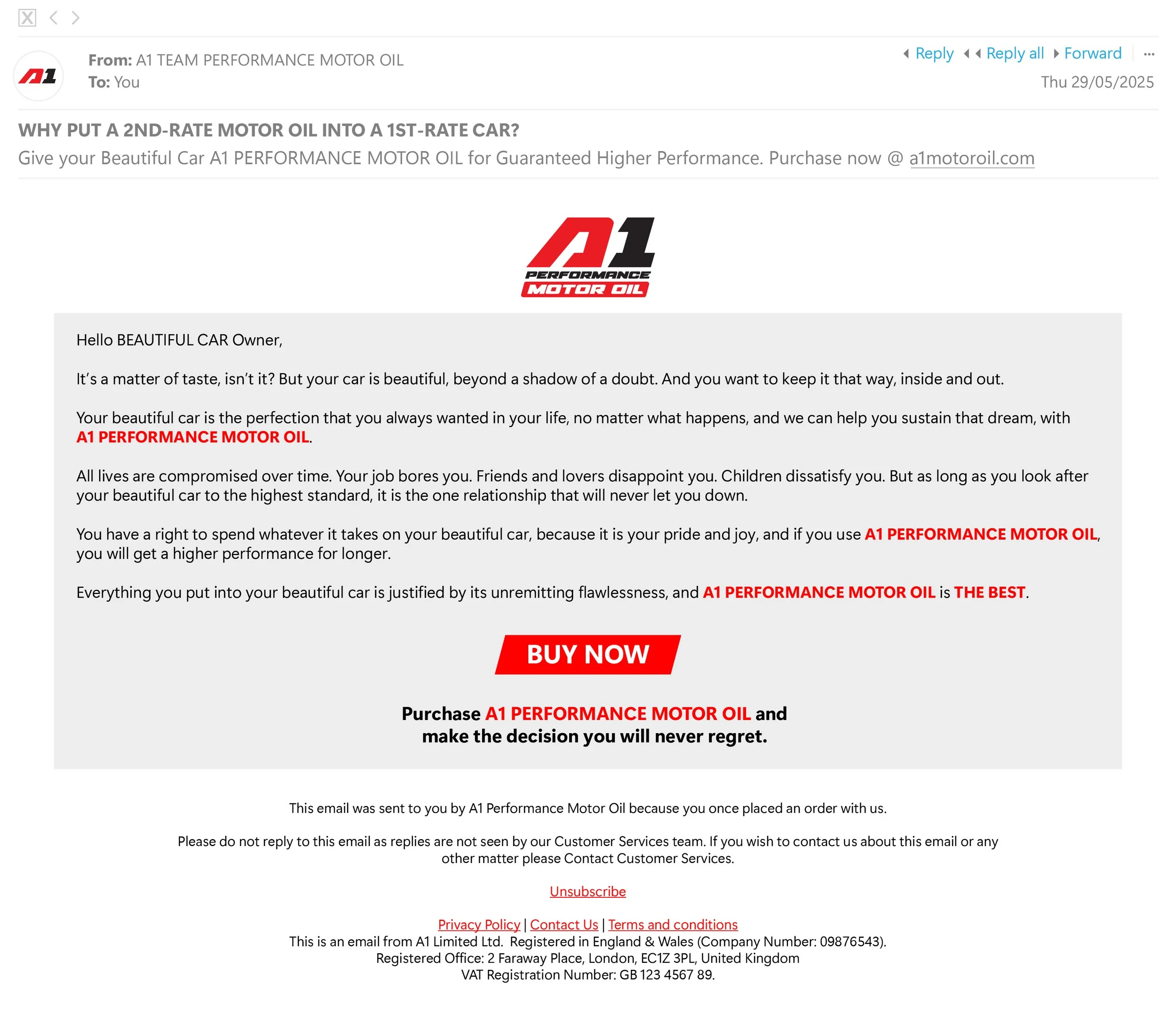 The brief was to write an email to sell a high performance motor oil - A1 Performance Motor Oil. The company wants to drive sales via the company website and to increase awareness of the motor oil. They want the tone to be exciting, urgent, promotional and serious.